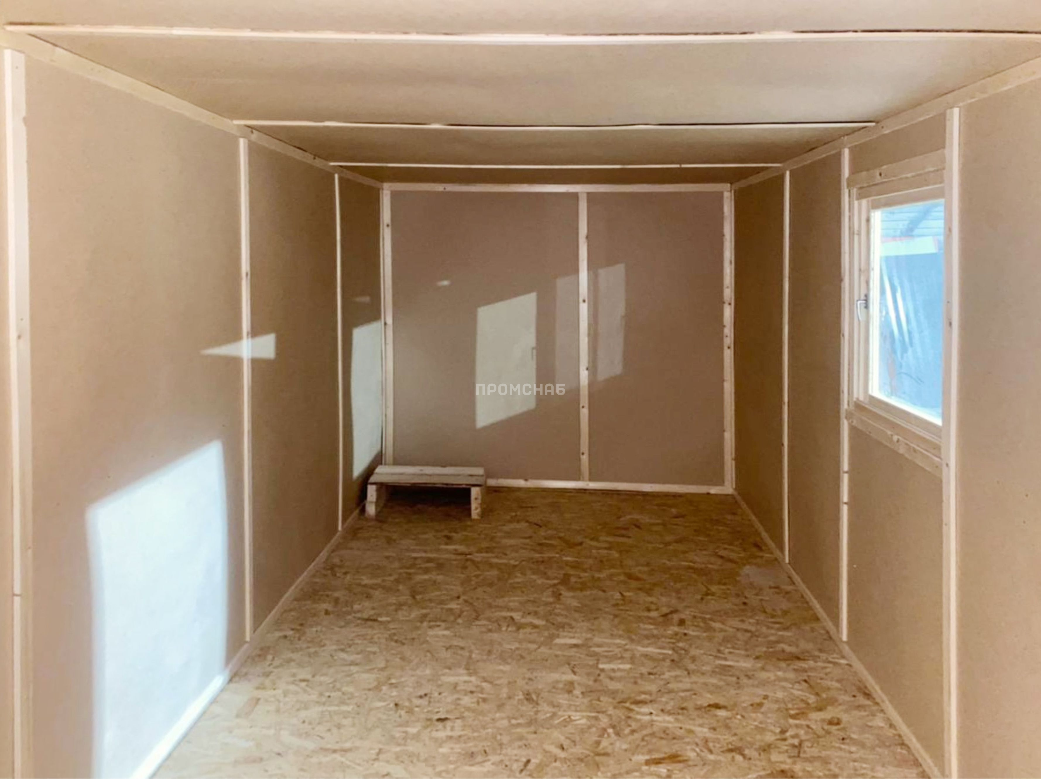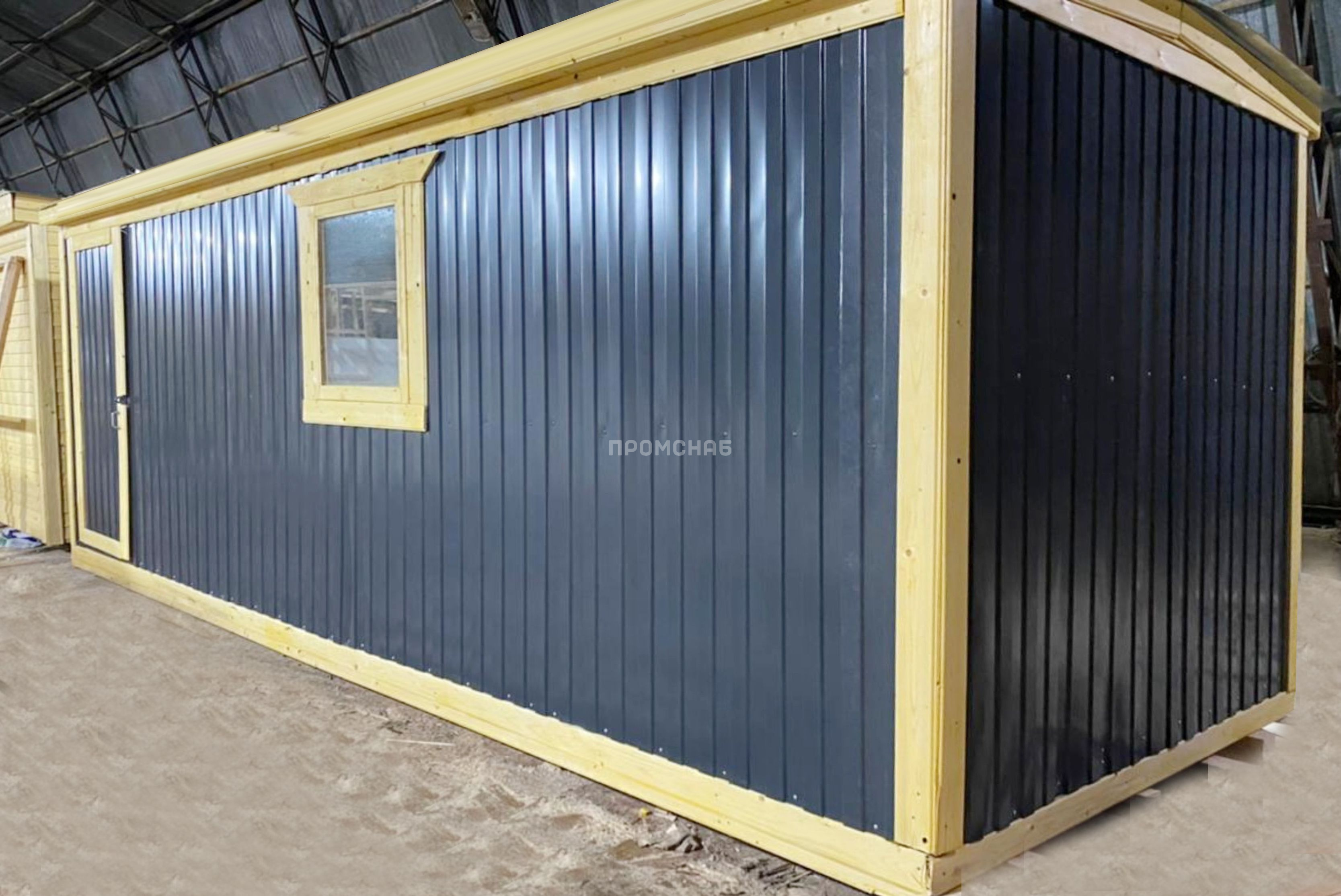 Габаритные размеры 6х2,3 метра Внешняя отделка Металл окрашенный Внутренняя отделка ДВП Утепление 50 мм – URSA Пол ОСБ Окно 1 шт. Дверь 1 шт. Крыша Оцинкованный металл