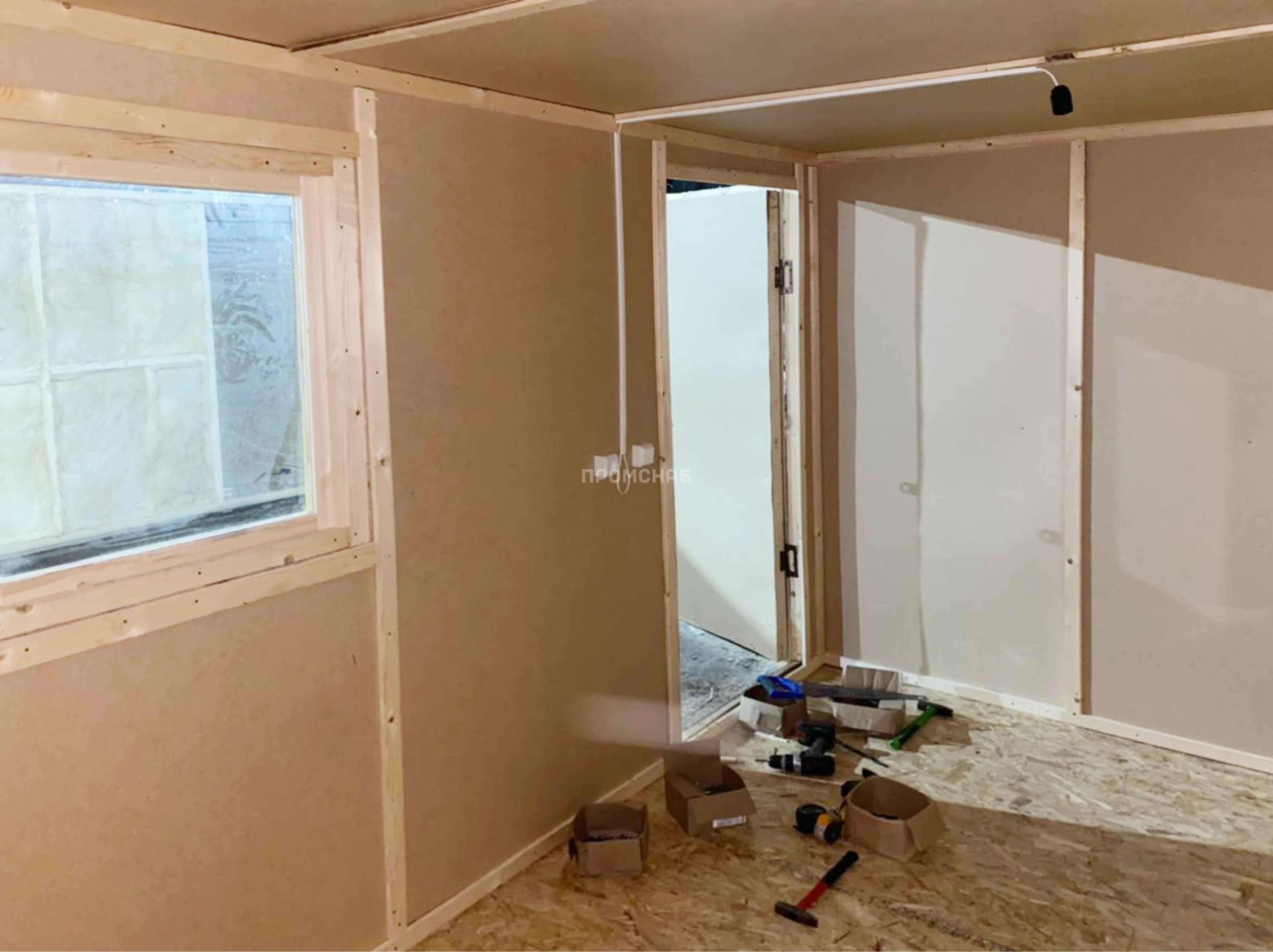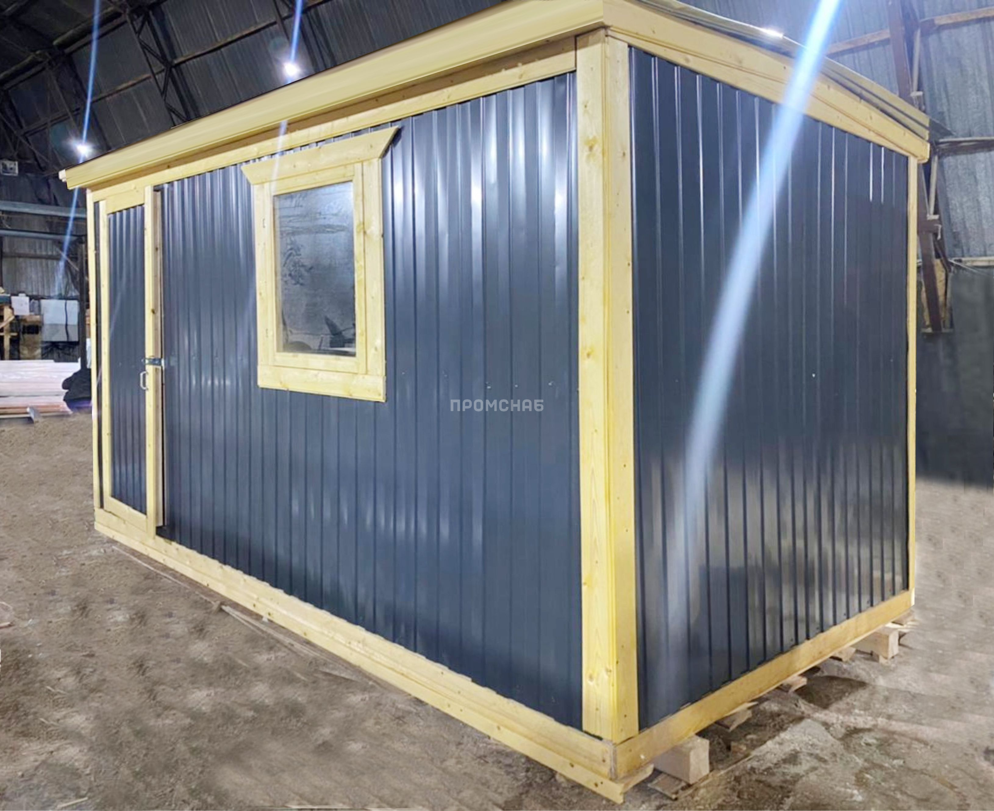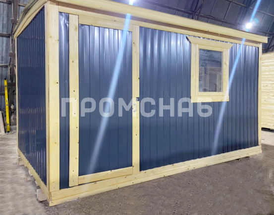 Габаритные размеры 4х2,3 метра Внешняя отделка Металл окрашенный Внутренняя отделка ДВП Утепление 50 мм – URSA Пол ОСБ Окно 1 шт. Дверь 1 шт. Крыша Оцинкованный металл