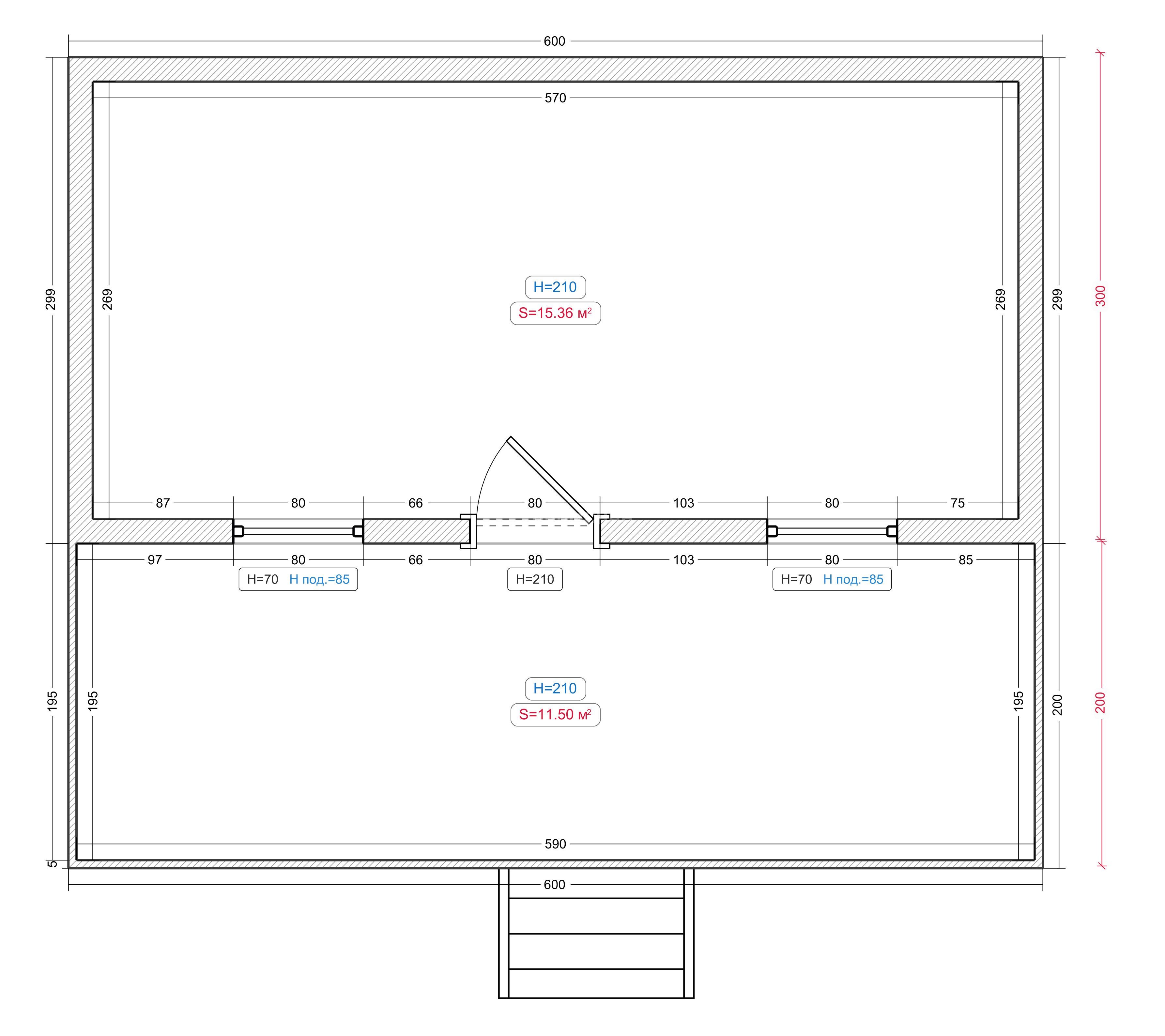 Высота потолка: 2100 мм (возможно увеличение до 2400 мм по желанию)