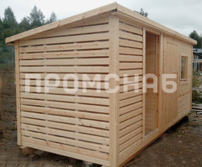 Популярная и вместительная утепленная постройка с металлической дверью. Сбоку бытовки расположен дровник закрытого типа с отдельным входом.